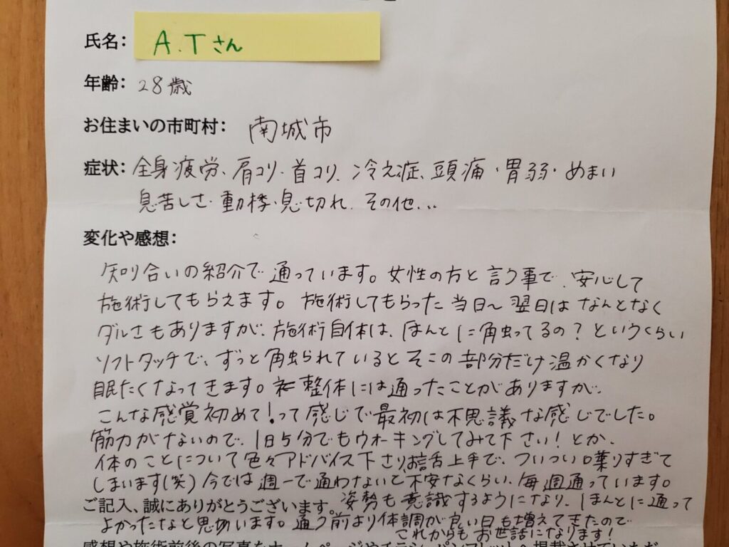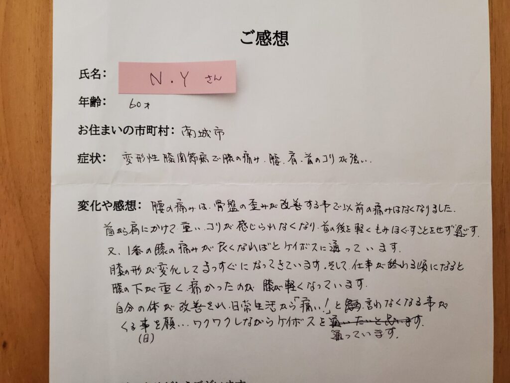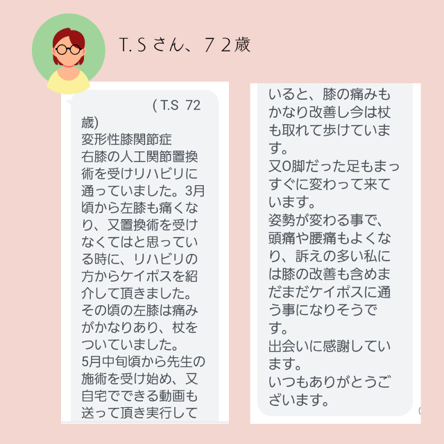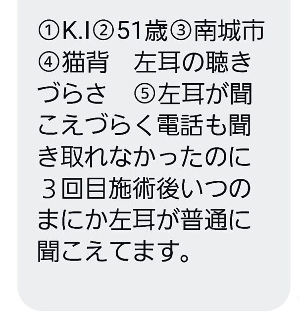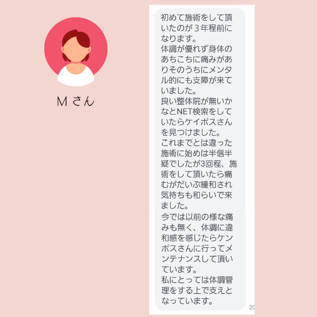 優れた に基づいています 7 レビュー に投稿されました mint HerbTrustindex は、レビューの元のソースが Google であることを確認します。 M.M 女性.40代(発症時期3年前) 3年前から首を左に回すと痛みがあり、 また腰のスベリ症で整形外科に通っていました。 どこの整形外科も同じ治療方で何度もぶり返す痛みに根本的な治療を受けたい!!と 諦めかけていた時、主人の知り合いから、 姿勢矯正ケイポスさんを教えて頂きました。 初めて知った施術で半信半疑でしたが、 骨盤、歪みを整える事から始まりました。 2回の施術で腰が楽になり、 首の施術をしていくたびに回る領域が広がり左に回せる様になり楽になりました。 ストレッチ方や体操も教えてもらえるので 根本的な治療になっています。 普段の姿勢や癖が関係してる事を、 気づかせてもらい今後もメンテナンスで 通わせて頂く予定です。に投稿されました 目取真綾乃Trustindex は、レビューの元のソースが Google であることを確認します。 子供のオスグッドで色々悩んでいる時に同じバスケの父母からの紹介で知り通う様になりました、初めて見た施術方法で最初は本当に良くなるのかなと半信半疑でしたが子供に変化が出始めてびっくりしました 施術だけではなくストレッチなど色々と教えて頂き本当に助かります、 先生もとても丁寧に一つ一つ教えてくれて分かり易い様に動画なども送ってくれて子供にストレッチ、痛みの有る時のマッサージなどを教えてもらいました、その甲斐あってほぼ痛みも取れたと子供が喜んでいます本当にありがとう御座いましたに投稿されました のまのまイェイTrustindex は、レビューの元のソースが Google であることを確認します。 (40代T・H男性 発症時期1年前) 私が最初に見てもらったのは、去年の9月上旬でした。弟の紹介で根本から痛みの治療をするからと半信半疑でやってもらいました。数日後には、痺れていた腕や神経が和らいでいきました。その前はと言えば痛みや痺れの耐えない生活で、近所の整形外科や整骨院を点々と通っていたのですが、こちらでは何と軽く触診しながらの治療を中心に患者に対して、今の状況と理想の状況を詳しく教えて下さったりと、痛みの根本治療とは、こう言うことなのかと驚きでした。わずか2回の治療で普通の生活が出来たので、凄く感謝してます。 まだ、ストレートネックや、猫背姿勢の歪みはあるので、今後ともお世話になると思います。宜しくお願いします。に投稿されました 花城久子Trustindex は、レビューの元のソースが Google であることを確認します。 katuya.h(50代) 何度か施術してもらいました。 施術してもらうたびに身体が軽くなって痛み痺れがあった場所も和らぎました。 1年前に大きな病院に受診した後、知り合いからの紹介で姿勢矯正ケイポスを紹介してもらい、どうだろーって思いながらも施術してもらいました。 病院では首からの手術も勧められましたが怖いのもあり病院での検査もしながら施術を半年、手術は保留になってます。 ケイポスでは施術と自分の50年間の姿勢の癖など気づかせてもらい痺れもほぼ感じなくなってます。これからも自分の身体のメンテナンスとしてケイポスへ施術に行くつもりです。に投稿されました 金城美幸Trustindex は、レビューの元のソースが Google であることを確認します。 触れてるだけなのに不思議と気持ちいいので 毎回爆睡してます。足の裏が痛かったのも治り、膝が痛くて歩いたり座るのが辛かったのが治り先週はとても忙しくて体中痛いのと背中がパンパン張ってるのもわかるぐらいだったのが帰る時には楽になりました。 おすすめですよ♪に投稿されました 金城環Trustindex は、レビューの元のソースが Google であることを確認します。 今までいろいろ行ってきた中で。施術してもらったら、頭スッキリ、肩の痛み楽になります。子どもも゙施術した日から鼻のつまりがなくなり良いと言っています。子どもから年寄りまで通えるのでとても良いです?に投稿されました usakie00Trustindex は、レビューの元のソースが Google であることを確認します。 股関節に痛みがあったので60分コースでお願いしました。 一般的な押したり揉んだりするような施術とは異なり、先生が触れる指先から微弱な電気が流れてるかの様な、でも全く痛くない不思議な施術でした。 最近生理痛が辛いと相談したらそちらも施術して頂き、すぐに実感出来るくらい楽になりました! 股関節の痛みもだいぶ良くなってるので、続けて通ってみようと思います。